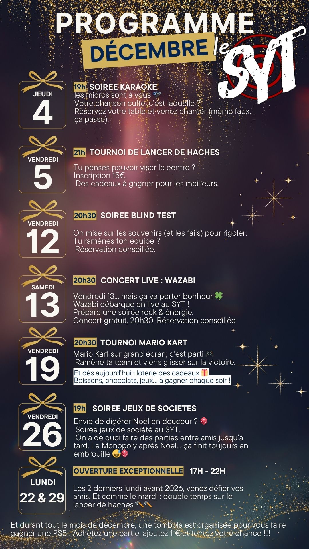 Le SYT, c’est bien plus qu’un simple bar à bières. C’est l’endroit incontournable pour tous ceux qui veulent se détendre après le travail, se retrouver entre amis, ou simplement passer un bon moment dans une ambiance unique. Lancer de haches, tir sur cibles, fléchettes… mais aussi bières artisanales, ambiance musicale, moments afterwork et planches.